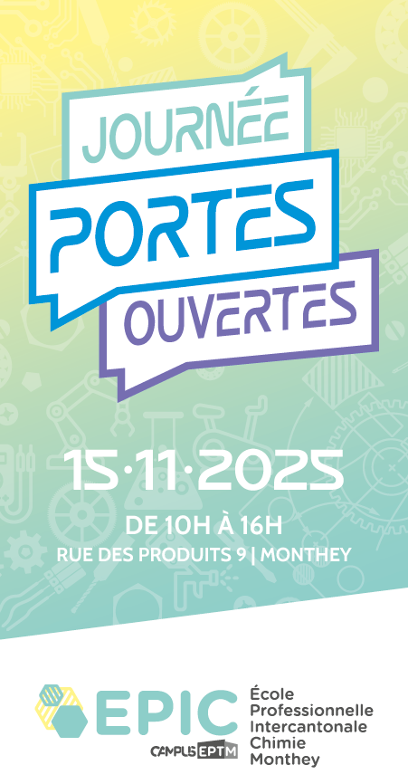 La journée Portes Ouvertes 2025 de l'EPIC aura lieu le samedi 15 novembre de 10h à 16h (participation libre, sans inscription). L'AVIC sera présente ainsi que ses membres : Bachem, BASF, CIMO Compagnie industrielle de Monthey SA, Huntsman, Siegfried Evionnaz SA, Sun Chemical, Syngenta, TRB Chem...